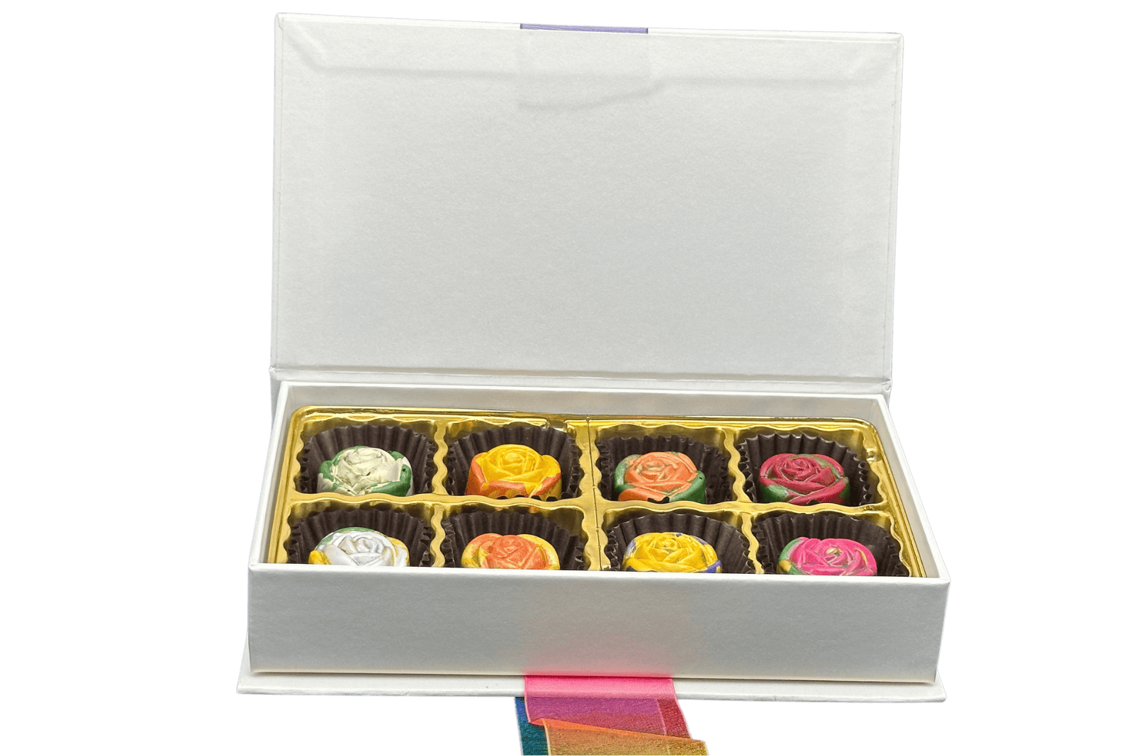 The Rose Collection features rose-shaped chocolates with vibrant fruit flavors and smooth Belgian chocolate. The deluxe 8-piece highlights fresh fruit purΓ©es for a bright, balanced experience. (Special Order Only).